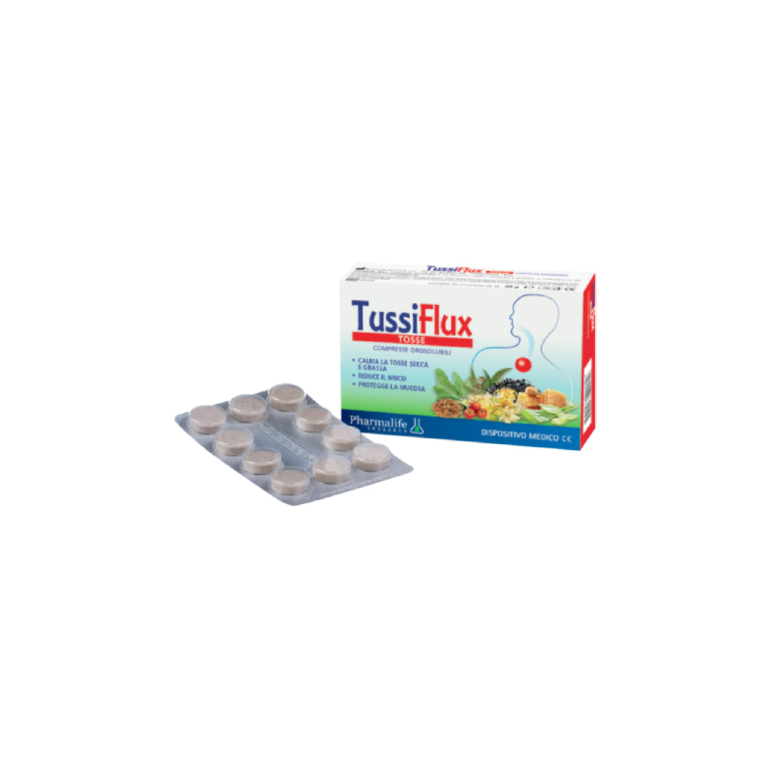 Tussiflux orodisperzibilne tablete za kašelj so medicinski pripomoček na osnovi propolisa, mire in drugih izvlečkov, za pomoč pri suhem in produktivnem kašlju ter draženju grla. Ob počasnem raztapljanju v ustih, na sluznici ustvari zaščitni film, ki ščiti sluznico dihal pred zunanjimi vplivi, hkrati pa spodbuja vlaženje in redčenje sluzi in nudi takojšnje olajšanje.