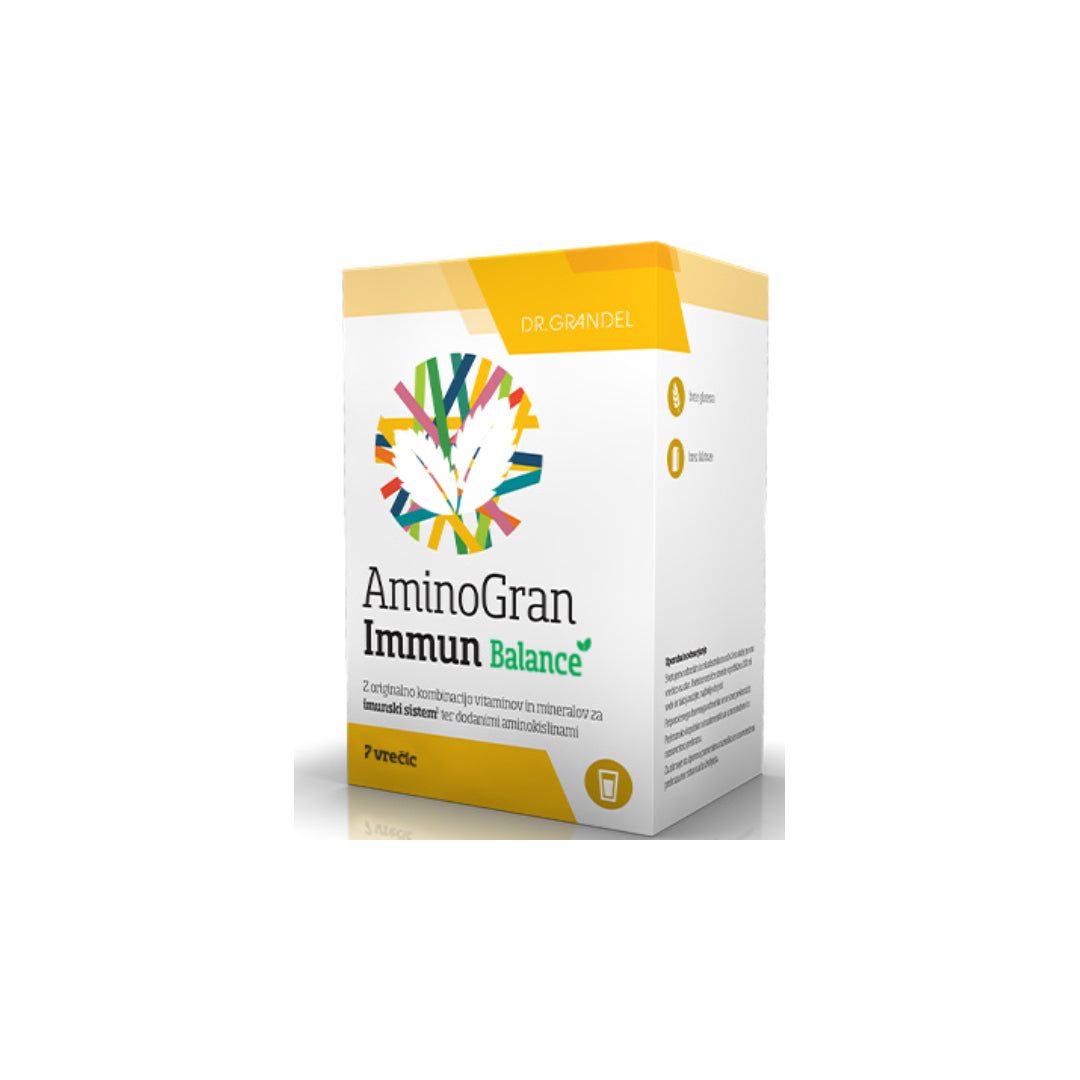 Aminogran Immun Balance je prehransko dopolnilo, ki združuje sedem aminokislin, sedem vitaminov in sedem mineralov, ki podpirajo normalno delovanje imunskega sistema, in prispevajo k zmanjšanju utrujenosti in izčrpanosti ¹.