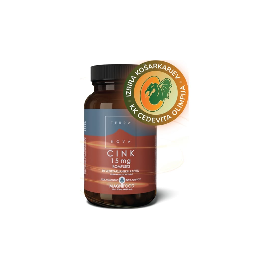 Cink kot mineral je potreben za delovanje več kot 70 encimov iz vseh encimskih razredov. V Terranovinem dopolnilu je cink v obliki bisglicinata, ki ga telo dobro izkoristi, ni agresiven za sluznico prebavil in učinkovito zvišuje vrednosti v krvi. Za večji sinergijski učinek so Terranovinemu kompleksu Magnifood dodane rastline, bogate s cinkom: bučnice, stabilizirani riževi otrobi, jagode acai in spirulina. Priporočamo ga za dvig Odpornosti, zdravo kožo, nohte in lase ter pri težavah z moško plodnostjo.