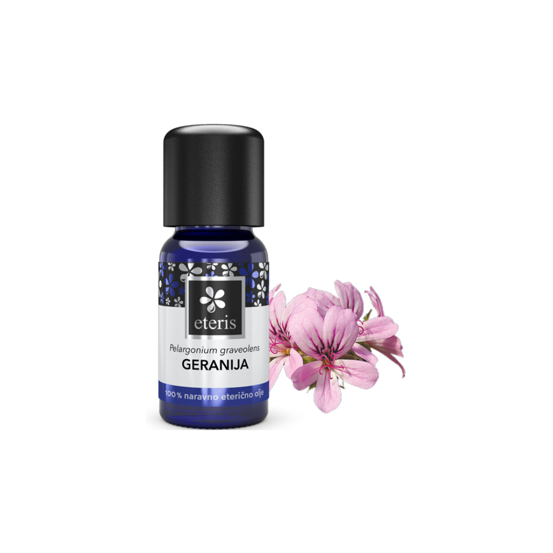 Geranija izvira iz južne Afrike, od koder so jo nizozemski mornarji v 17. stoletju prinesli v Evropo, kjer je zaradi svojega prijetnega vonja in številnih zdravilnih lastnosti postala zelo cenjena in iskana rastlina. Eterično olje geranije ima tako širok razpon uporabe, da je v aromaterapiji poznano kot panaceja oz. vsestransko učinkovito olje. Je idealno olje za vzdrževanje telesnega ravnovesja, poznamo ga kot adaptogen – izboljša prilagoditev telesa na stres. Je eno pomembnejših olj za nego kože, tako nečiste kot občutljive in nagnjene k ekcemom ter luskavici. Ima prijeten vonj, s toplo srčno noto, nekoliko citronski in podoben vonju vrtnice. V prostoru ustvarja sveže, harmonično ozračje.