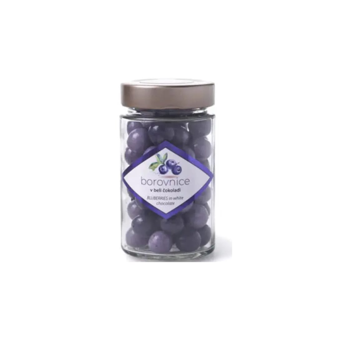 Oblite borovnice v beli čokoladi so koščki naravnega sadnega (borovničevega) želeja, obliti z belo belgijsko čokolado z dodatkom liofiliziranih borovnic, 125 g.