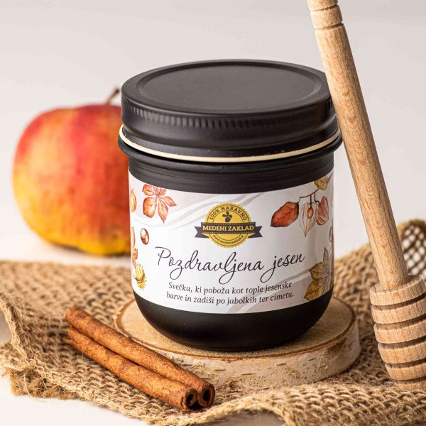 Svečka “Pozdravljena jesen” bo vaš dom pobožala kot tople jesenske barve in toplo bo zadišalo po jabolkih ter cimetu.