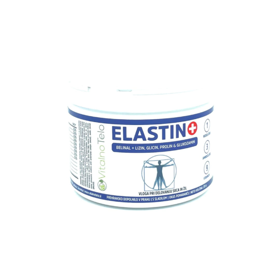 ELASTIN + 205 g je prehransko dopolnilo. Edinstvena formula 3 aminokislin L-lizin, L-glicin in L-prolina v optimalnem razmerju, z vitamini je plod dolgoletnih raziskav. Dodan je tudi izvleček bele jelke Belinal. ElastinPlus ima vlogo pri delovanju srca in ožilja.