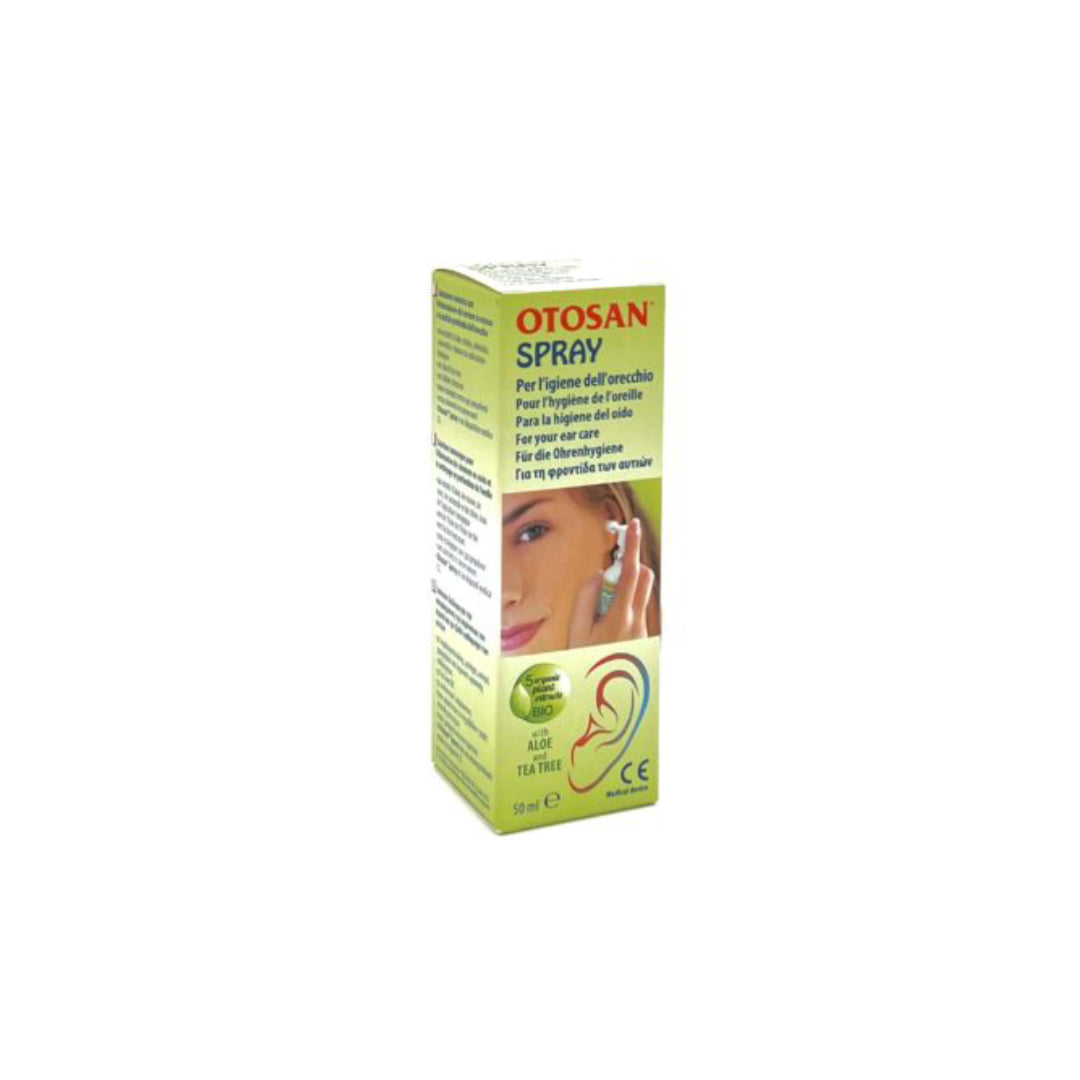Izotonična raztopina za odstranjevanje odvečnega ušesnega masla in čiščenje sluhovoda. Z izvlečki aloje, slezenovca, ognjiča, kamilice in limone iz ekološke pridelave. Vsebuje olje čajevca, vlažilno sredstvo. Okolju prijazno pršilo, ki ne vsebuje potisnih plinov. Brez barvil in konzervansov. Pršilo Otosan® Spray je medicinski pripomoček z oznako CE. Učinkovine: voda, izvleček* cvetu ognjiča (Calendula officinalis), izvleček* cvetu kamilice (Chamomilla recutita), olje čajevca (Melaleuca alternifolia), izvleček* limonine lupine (Citrus medica limonum), izvleček* lista gozdnega slezenovca, izvleček* lista aloje (Aloe barbadensis), natrijev klorid. *Organska/ekološka pridelava". Uporaba od 2,5 leta starosti. Vsebina: 50ml.