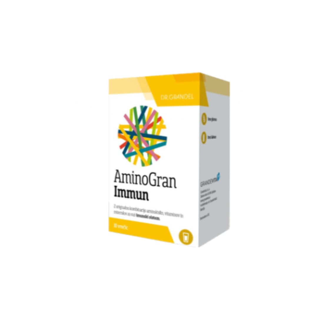 AminoGran Immun, prehransko dopolnilo s sladilom. Z originalno kombinacijo vitaminov in mineralov za imunski sistem1 ter dodanimi aminokislinami.