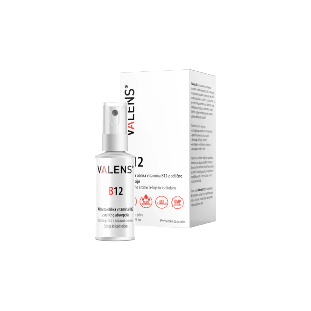 Valens B12 je prehransko dopolnilo v priročni obliki ustnega pršila z odličnim okusom češnje. Vloga vitamina B12 je zmanjševanje utrujenosti in izčrpanosti, normalno delovanje živčnega sistema in tvorjenje rdečih krvnih teles. Valens B12 je še posebej primeren za vegetarijance in vegane, ki s prehrano ne dobijo dovolj vitamina B12. Izdelek v enem razpršku vsebuje 250 μg aktivne oblike vitamina B12 – metilkobalamina.