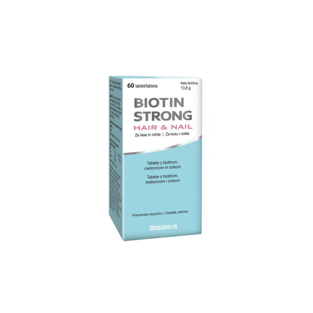 Tablete Biotin Strong hair & nail vsebujejo edinstveno kombinacijo biotina in cinka, ki dokazano prispevata k ohranjanju zdrave kože in las. Metionin, ki vsebuje žveplo, daje keratinu, ključnemu gradniku las in nohtov, značilno trdnost in čvrstost. Vsebnost biotina je precej višja kot v ostalih prehranskih dopolnilih s podobnimi indikacijami.