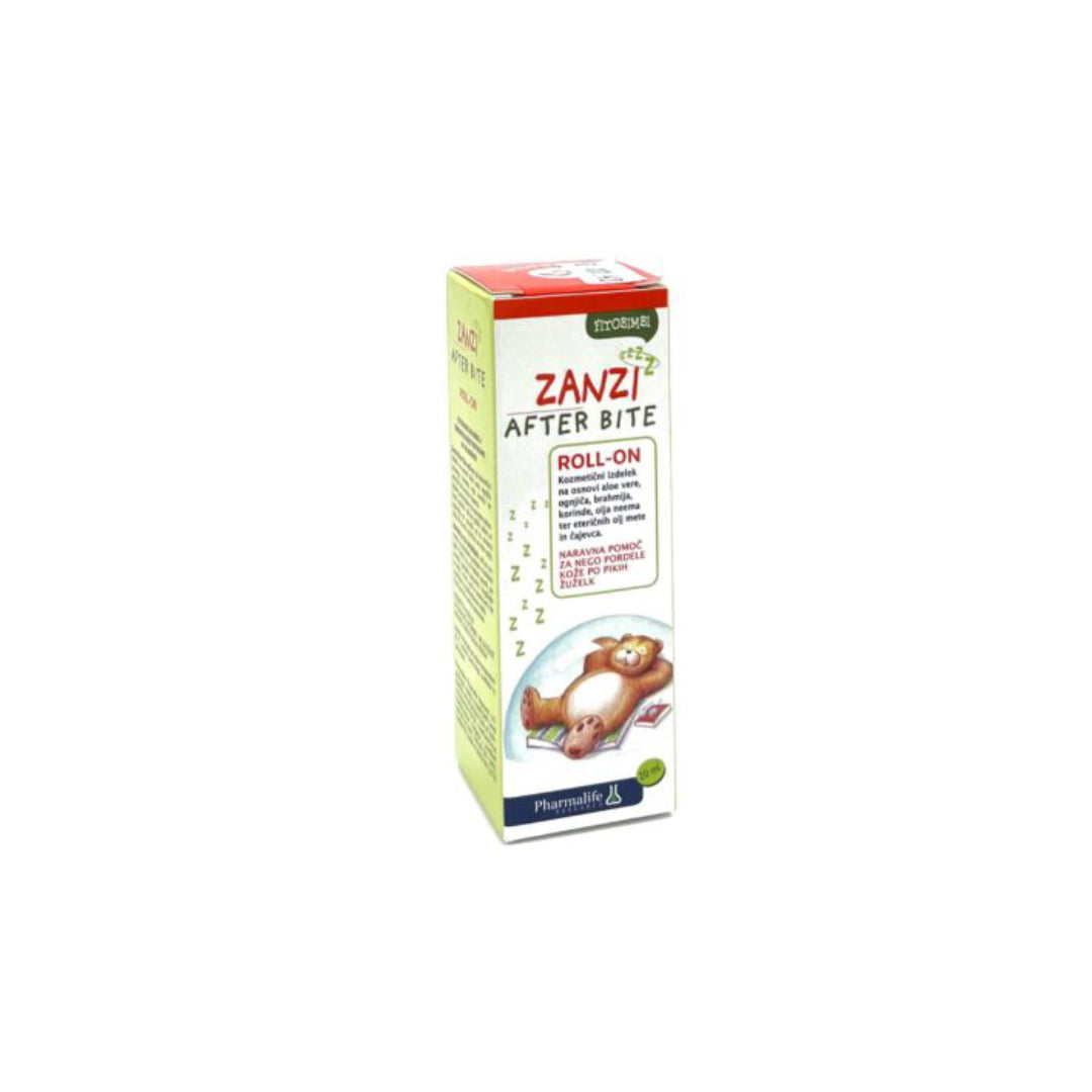 Izdelek Fitobimbi Zanzi Roll-on After Bite iz naravne linije Fitobimbi za nego pordele kože po pikih žuželk. Naravna kozmetična formulacija na osnovi aloe vere, ognjiča, brahmija, korinde, neemovega olja ter eteričnih olj mete in čajevca.