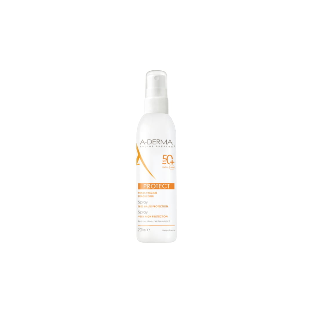 A-DERMA PROTECT pršilo SPF50+ zelo visoka zaščita pred UVB- in UVA-žarki. Vodoodporno. Ne pušča belih sledi.