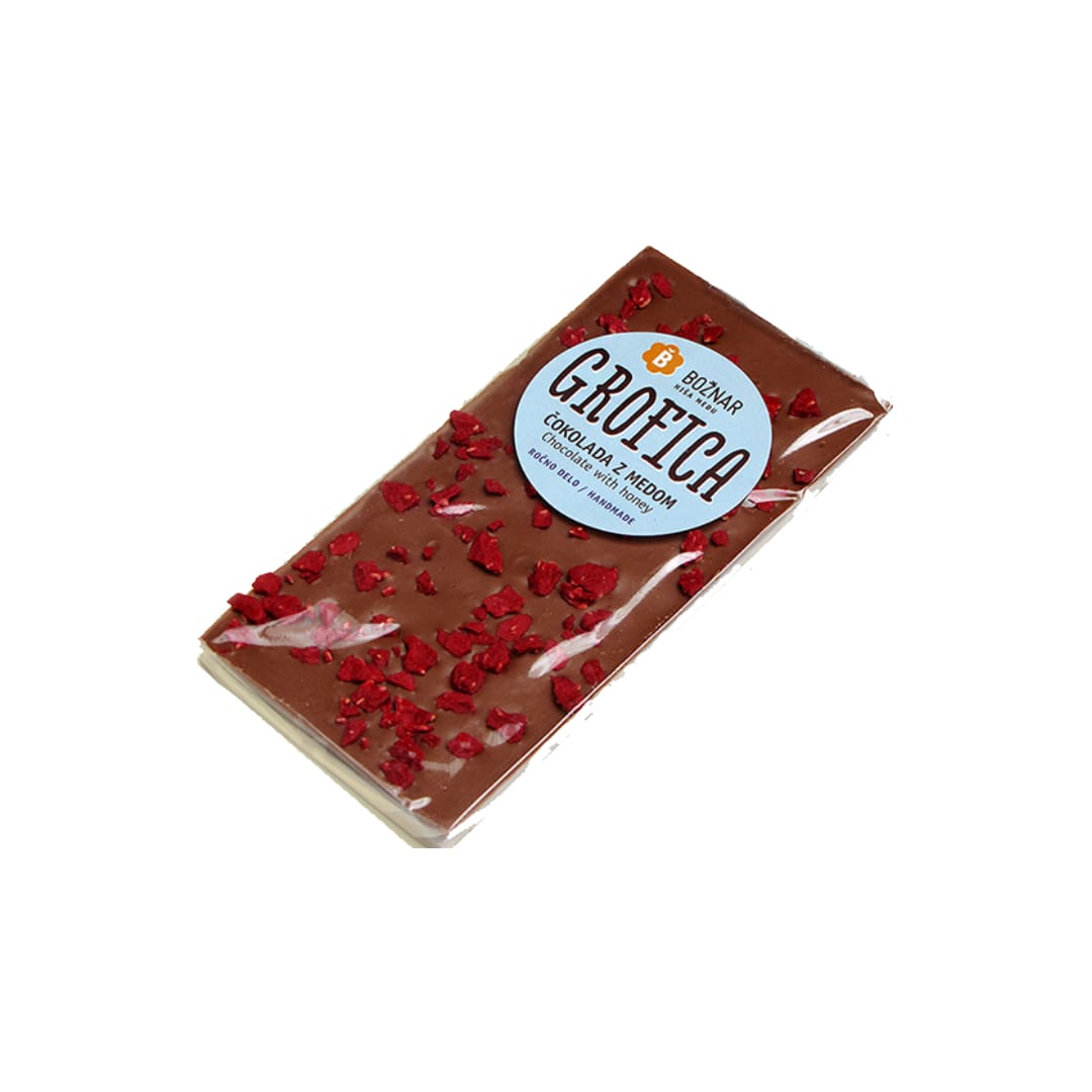 Čokolada z medom je pripravljena iz najboljše belgijske čokolade. Tablico smo posuli s posušenimi malinami.