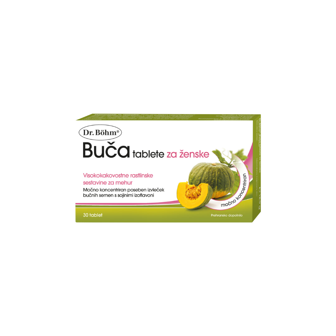 Ugodno delovanje bučnih semen na mehur je znan že več stoletij. Prehransko dopolnilo Dr. Böhm® Buča tablete za ženske vsebuje izvleček semen štajerske buče, ki s posebnimi vodotopnimi sestavinami podpira delovanje mehurja. Nahajajo se v delu brez maščobe in ne v olju bučnih semen. Za doseganje polnega potenciala sestavin iz visokokakovostnih bučnih semen je potrebno ustrezno odmerjanje. Koncentracija izvlečka v eni tableti ustreza 8 g bučnih semen, kar je približno 40 bučnih semen. Tabletam so dodani tudi dragoceni sojini izoflavoni (brez gensko spremenjene tehnologije).