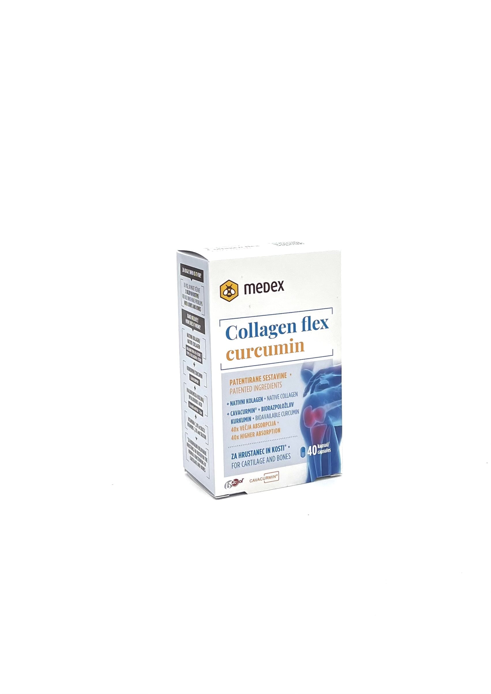Collagen flex curcumin je izdelek z nativnim (nedenaturiranim) kolagenom s kurkumo, hialuronsko kislino, silicijem ter vitaminoma D in C za podporo normalnemu delovanju hrustanca in kosti. Vitamin C ima vlogo pri nastajanju kolagena za normalno delovanje hrustanca in kosti, vitamin D pa prispeva k ohranjanju zdravih kosti in delovanju mišic ter k normalni absorpciji kalcija in fosforja.