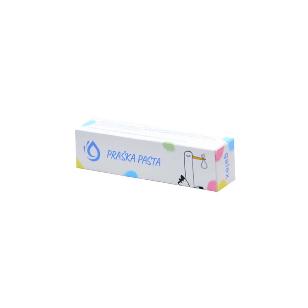 Praška pasta deluje blago antiseptično, suši in spodbuja obnavljanje kože. Posebej primerna je za zaščito občutljive otroške kože. Preprečuje draženje in nastanek rdeče kože ter manjše izpuščaje pod plenicami.